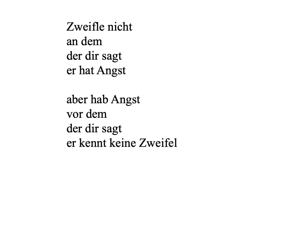 Textquelle: Erich Fried: Angst und Zweifel, in: Erich Fried Gedichte, dtv Verlagsgesellschaft, München 2018, S. 45. [EA: 1995]